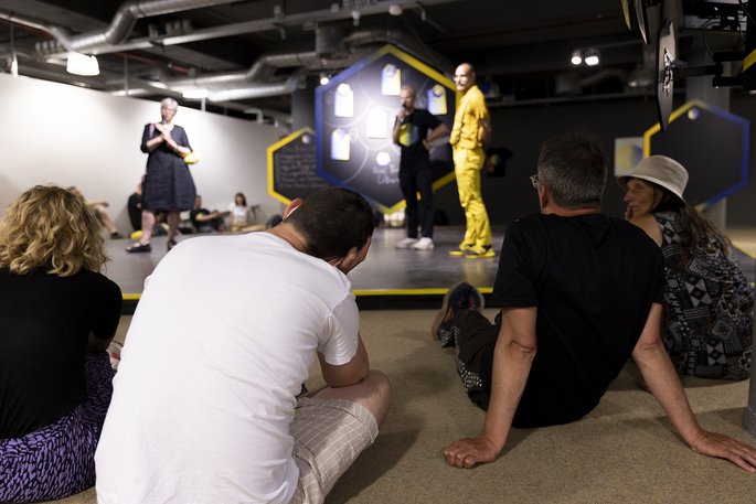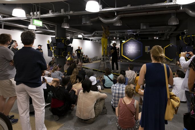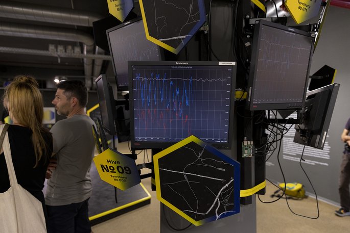 Dargestellt durch Daten, algorithmische Interpretationen und Smart Contracts treten Bienen und Menschen in eine performative Interaktion, gestalten gemeinsame Entscheidungsprozesse und öffnen ihren gemeinsamen Reichtum für die Besucher*innen der Documenta15.